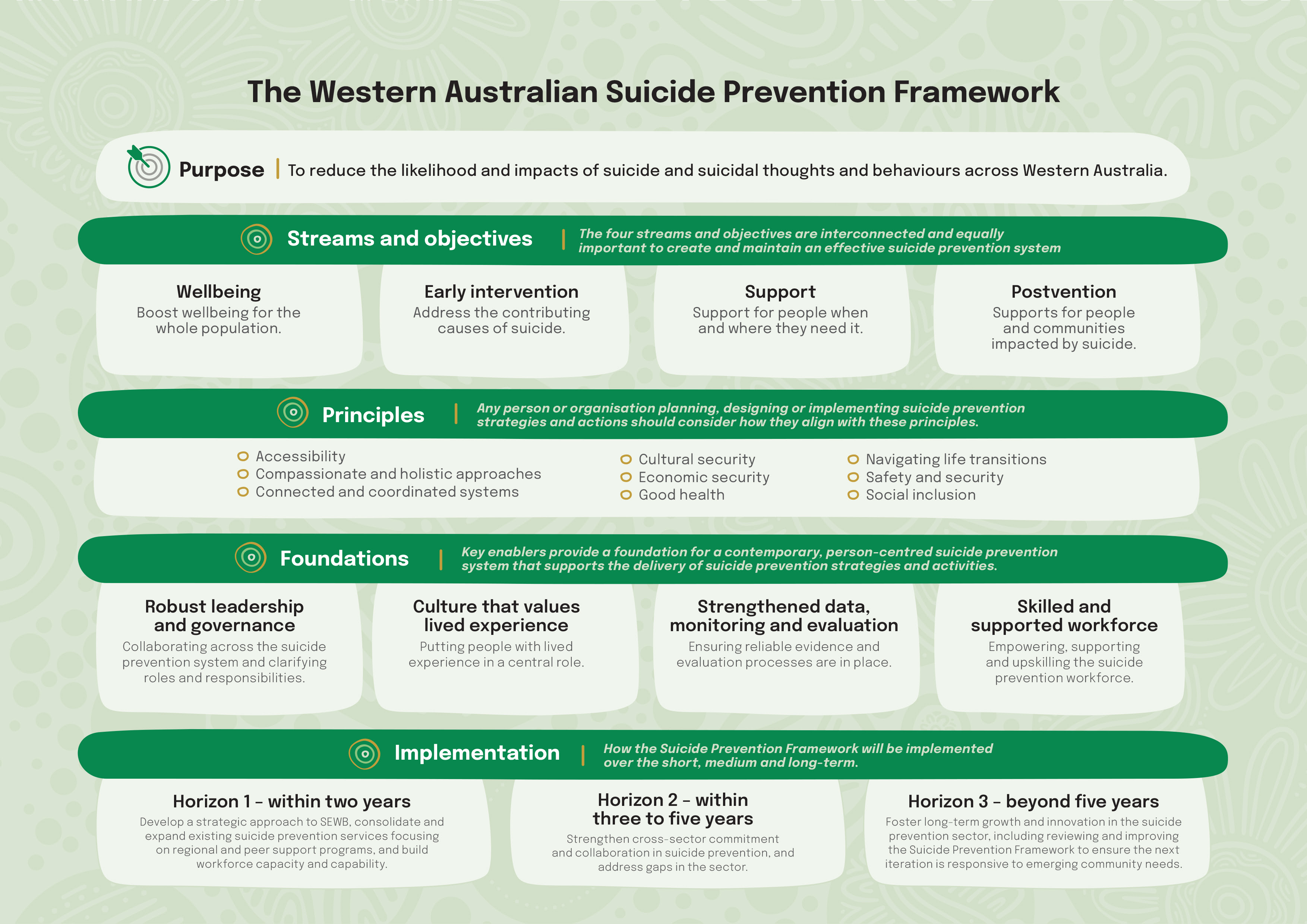 The Mental Health Commission (Commission) is developing a new Western Australian Suicide Prevention Framework (Suicide Prevention Framework). The Suicide Prevention Framework will set out Western Australia’s approach to suicide prevention for the next five years and builds on the significant work carried out under previous national and statewide suicide prevention strategies, reports, and approaches.