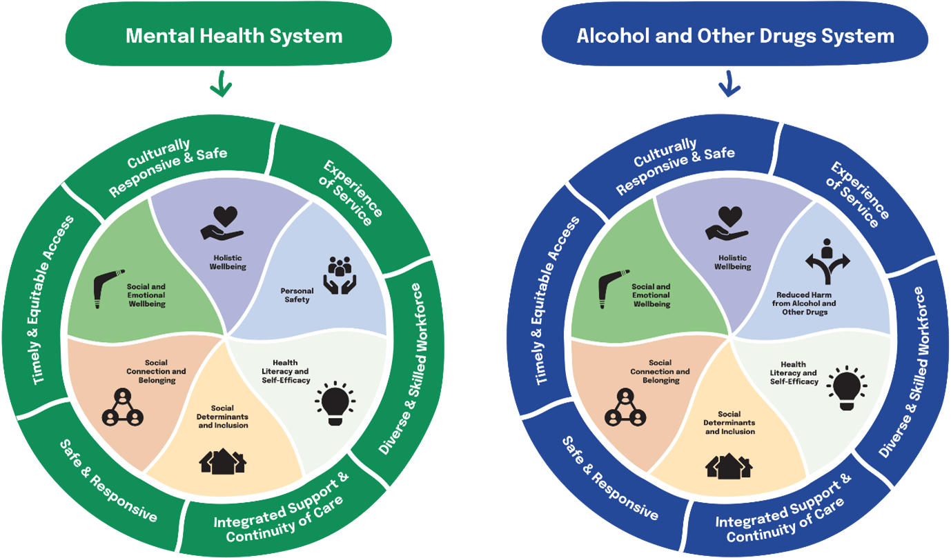 The wheels above represent the 12 domains of the mental health and alcohol and other drugs OMF. The outer wheel domains describe the outcomes that Western Australians want to experience from mental health, alcohol and other drug services, programs, and initiatives. The inner wheel domains describe person-centred outcomes related to mental health, alcohol and other drug use among the Western Australian population.